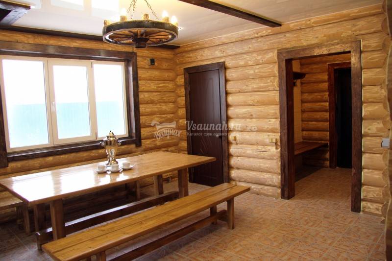 Стильное оформление бани с большой комнатой отдыха, позволяют продолжить общение в атмосфере уюта и расслабления.